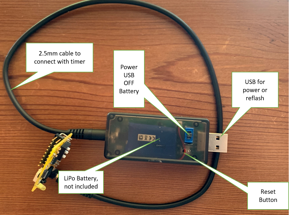 This version can be powered from a USB source or from a single cell LiPo. Because of special requirements in shipping LiPos by air we do not include the LiPo. One that fits is the Hyperion G5 50C Max 1S 180 mAh with Ultra Micro connector. The part number is HP-G550-0180S1UM. The connector is a Molex Pico Blade 1.25mm. It is shown in the picture. It measures 31 x 20 x 5.0mm . The Dongle comes with a 2.5mm to 2.5mm cable. If you a have a Magic Timer with a different connector you should request the appropriate cable. You can also request a cable with the Pico Blade connector to use with your own LiPo battery and/or a charge cable for the internal battery that plugs into the side of the dongle. The Dongle has status LEDS that indicate the state of the BLE connection and actions between the Android devices, Dongle and timer. The Dongle has Magic Timers supplied firmware and any upgrade to this can be loaded by the customer using a USB connection with a PC.